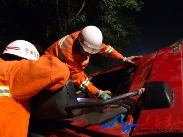 8月24日凌晨3時50分位于京滬高速60公里處,一輛大貨車撞上護欄,由于速度過快,滑行數十米后,側翻在路邊的排水溝,油箱破損,燃油大量泄漏,空氣中汽油味道濃重,有人員被困在車內,情況十分危急。泰安消防支隊新汶中隊接警后迅速出動2車12人趕往現場。