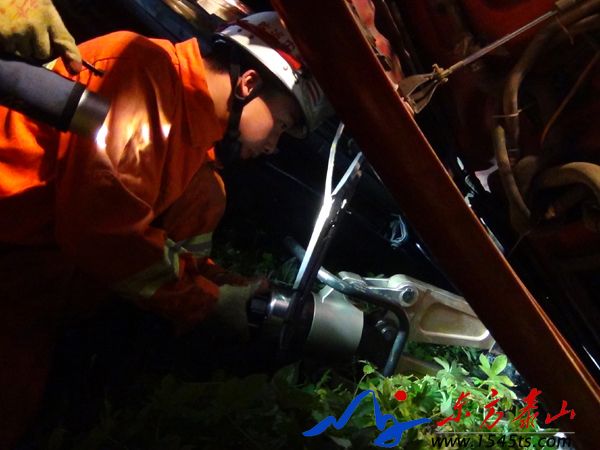 消防官兵到達現場后,根據現場偵察情況,中隊指揮員立即下達命令展開救援,劃分兩個戰斗小組:第一戰斗小組出泡沫槍一支,對其車體漏油處及四周進行泡沫覆蓋,防止因漏油引起爆炸。第二戰斗小組架設移動照明設備并展開救援。由于貨車頭部重量過大且變形嚴重,被困者腰部以下被死死卡住,危在旦夕,為了更好的進行營救,中隊聯系了交警部門請求調集吊車進行協助救援。